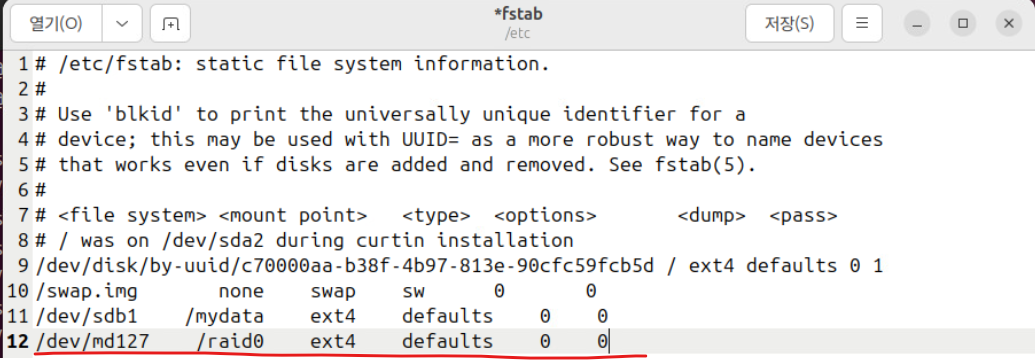 - 맨 첫 번째 영역에는 마운트된 파일 시스템 경로인 /dev/md127처럼 확인되는 경로를 넣어준다.