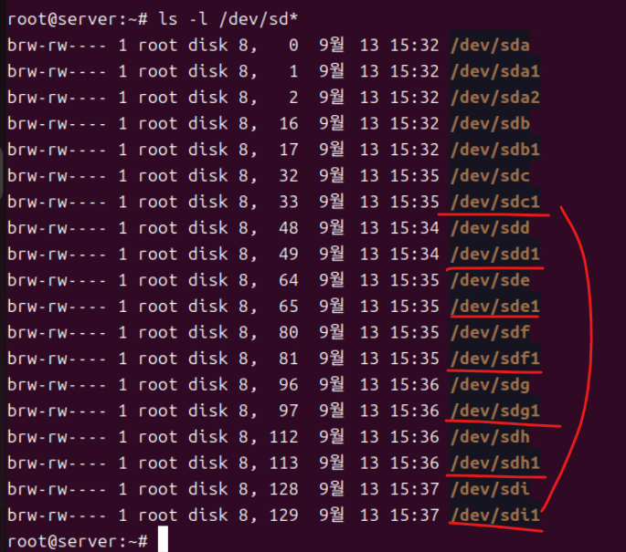 (4) 위와 같이 파티션을 생성한 후 ls -l /dev/sd*으로 생성된 파티션을 확인한다.