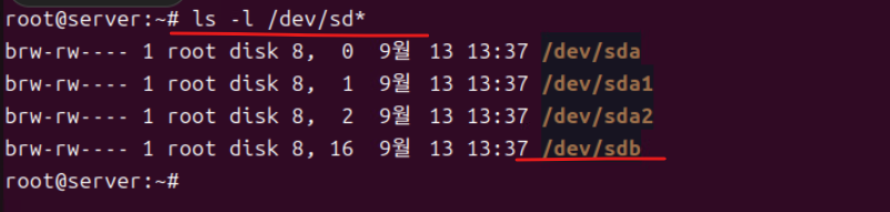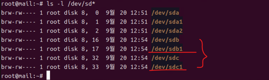 (2) 하드 디스크를 추가하고 재부팅한 뒤 ls -l /dev/sd*로 추가된 물리 디스크 확인한다.