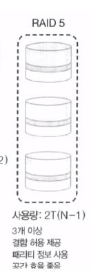 (3) 대부분 5개 이상의 하드 디스크로 구성하며 하드 디스크에 오류 발생 시 패리티 비트를 통해 복구를 수행한다.