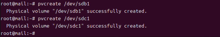 (6) pvcreate /dev/sdb1, pvcreate /dev/sdc1 (물리 볼륨 생성)