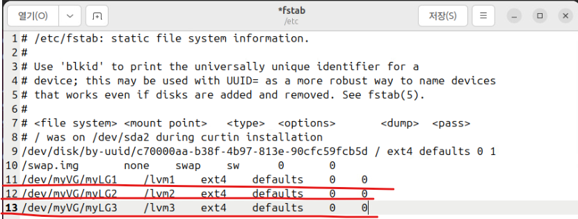 (17) geditor /etc/fstab에 각 내용 추가