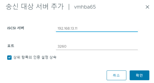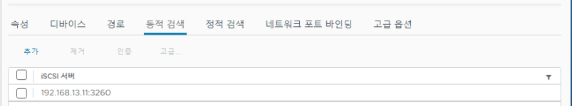 (7) 이후 iSCI (IP Storage) 가상 머신을 인식하기 위한 동적 바인딩이 필요하다. / 동적 검색 항목에서 추가 버튼을 누른다.