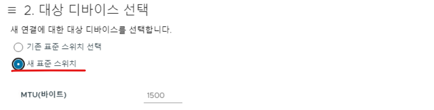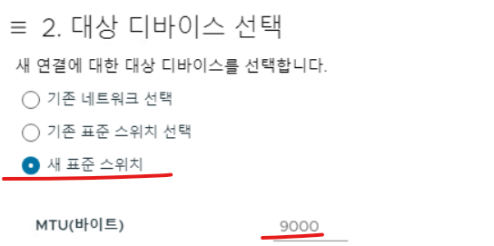(5) 새 표준 스위치를 선택하고 MTU Size는 9000으로 준다.