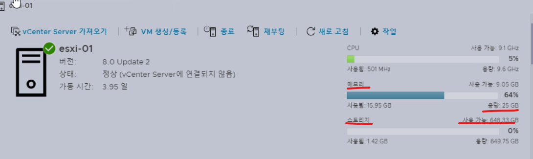 (28) 생성한 호스트에 대해 우측 영역에서 스토리지, 네트워킹, VM 등에 대해 여러 가지 세부 작업을 수행할 수 있다.