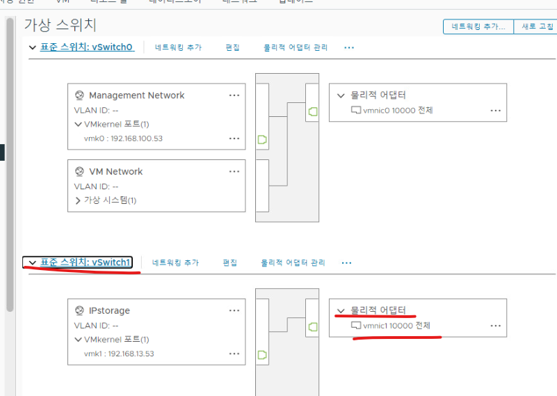 (1) 스토리지 통신을 위해 생성한 스위치를 삭제하고 새로운 가상 스위치를 할당하는 작업을 해주어야 하는 상황.