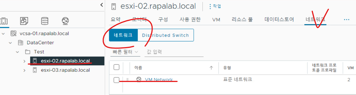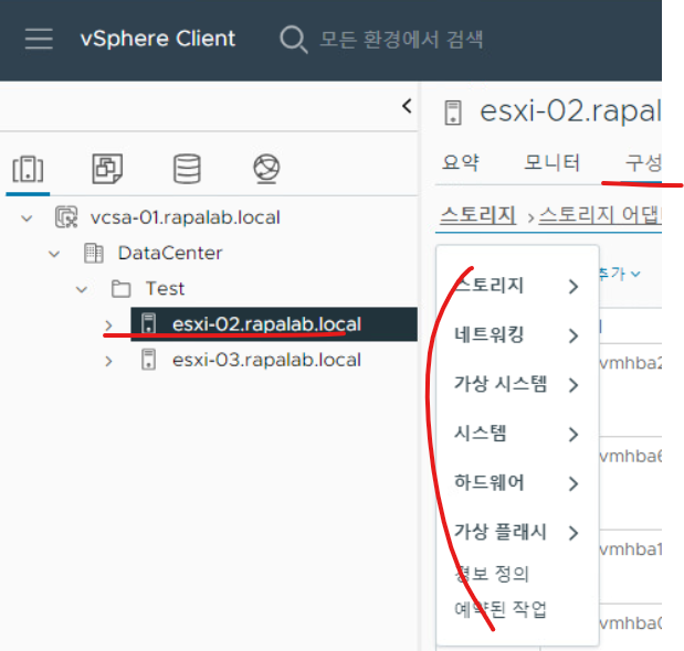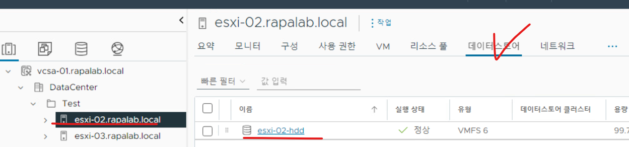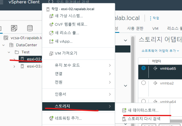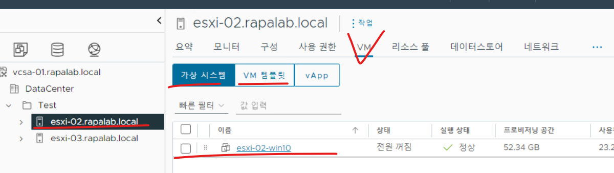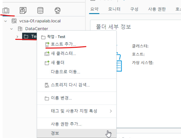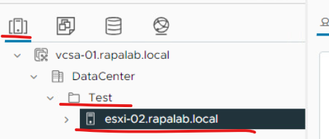 (23) 호스트 정보로 조회하면 DataCenter > Test 디렉터리에 esxi-02.rapalab.local 호스트가 새로 생성된 것을 확인할 수 있다.