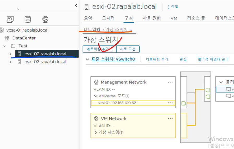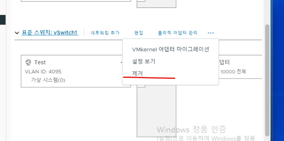 8-5. vCenter Server로 접속 후 작업 : 기존 vSwitch1 제거 & VMKernel 포트를 위한 가상 스위치 추가