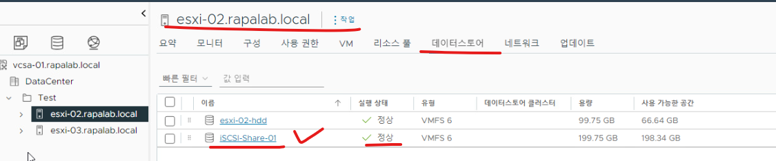 (30) ESXi-03 호스트를 기준으로 디바이스에 대한 데이터 스토어가 모두 인식된다.