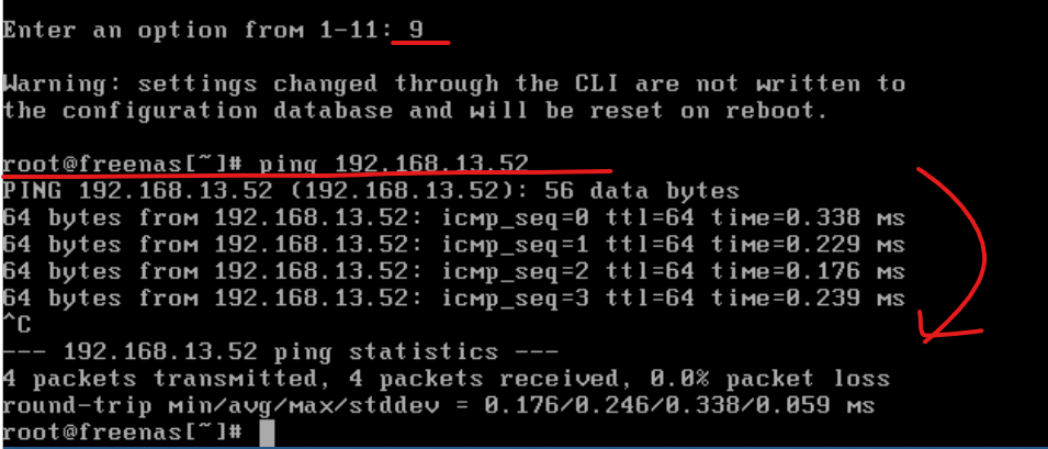 (1) 9번 옵션을 적용해서 콘솔을 열고 esxi-02 호스트의 VMKernel 주소 대역으로 ping을 수행해 보면 정상 수행된다. iSCSI 통신이 가능하다는 의미를 갖는다.