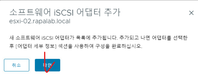 (1) esxi-02 호스트를 기준으로 스토리지 > 스토리지 어댑터 항목을 통해 iSCSI 디스크를 인식할 수 있도록 드라이버를 인식시켜야 한다.