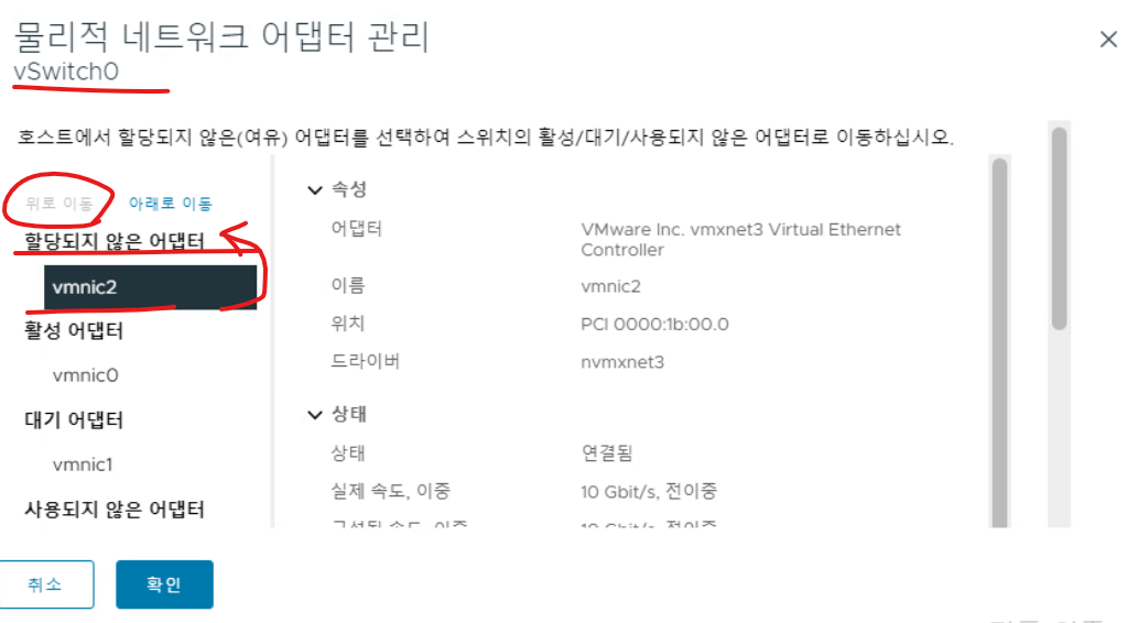 (23) vSwitch0 설정으로 접속해서 방금 활성화된 포트 2개를 할당되지 않은 어댑터 옵션으로 변경한다.