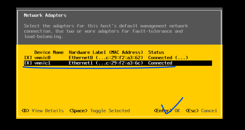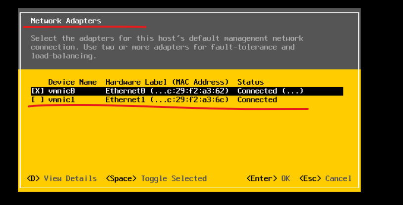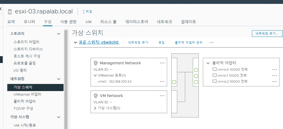 (2) vSwitch1 가상 스위치를 날리게 되면, 해당 스위치에 할당되어 있던 VMNIC2 포트도 함께 풀린다. 그 부분까지 작업하고 vSwitch0을 기준으로 나머지 VMNIC1, 2 인터페이스를 모두 할당되지 않은 항목으로 이동시킨다.