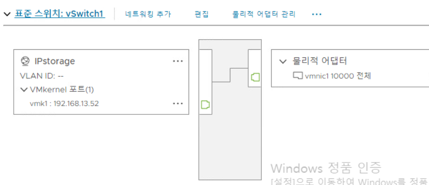 (11) iSCSI 통신을 위한 가상 스위치에 어댑터 포트가 할당된 것을 확인할 수 있다.