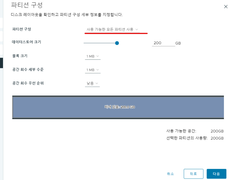 (16) 전체 파티션을 사용할 수 있도록 파티션 구성을 설정해 주고 다음으로 넘어간다.