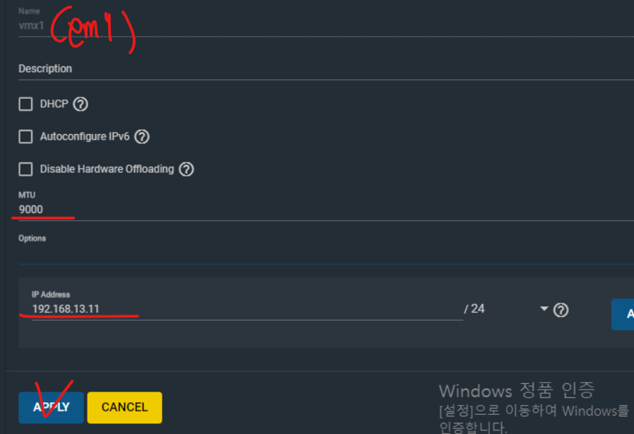 (8) vmx1 인터페이스에 대해 토폴로지 구성을 참고해서 주소를 입력하고 MTU는 9000으로 입력한다.