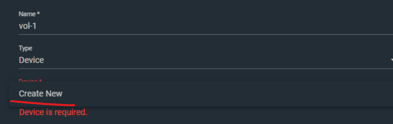 (10) 이름은 "vol-1", Device의 경우 새로 생성하기를 클릭한다.