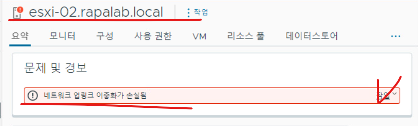 (3) 이 작업까지 완료하면 esxi-02 호스트 기준으로 업링크 이중화가 손상되었다는 오류 메시지가 확인되는데, 우측 작업을 을 누르고 녹색으로 변경 옵션을 클릭한다.