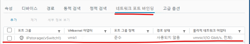 (4) 이전에 만든 가상 스위치의 NIC와 iSCSI 드라이버를 여기서 연결한다. (네트워크 포트 바인딩)
