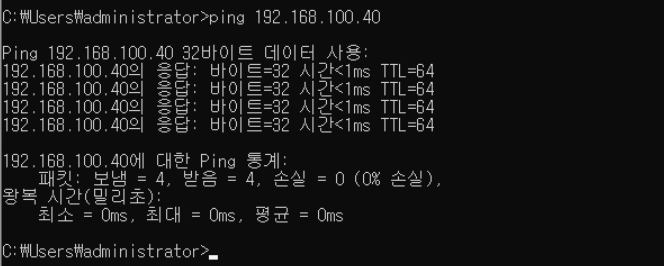 8-3. Windows 10 환경으로 접속 / ping 테스트 / 192.168.100.40으로 접속되는지 확인