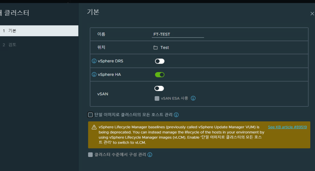 - 위와 동일하게 FT-test 디렉터리에 esxi-02, 03 호스트를 추가 & 클러스터 재구성 & 스위치 VMKernel Fault Tolerance Logging 활성화를 진행한다.