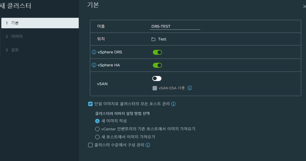 (1) 새로운 클러스터를 위와 같이 추가한다. DRS 기능을 사용하기 위해 vSphere DRS 옵션을 활성화한다.