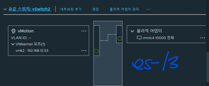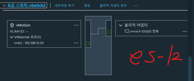 4-2. 물리적 NIC를 추가한 후 ESXi-12, 13 호스트 기준 가상 스위치 재설정 완료(vMotion VMKernel 간 마이그레이션 여부까지 확인)