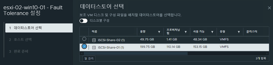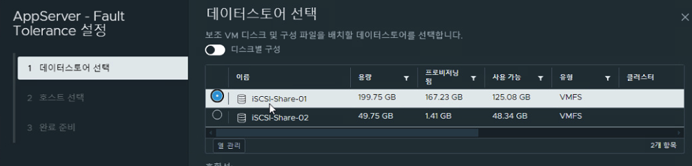 - 보조 vm 디스크 및 구성 파일을 배치할 데이터스토어( iscsi-share-01 )를 지정한다.