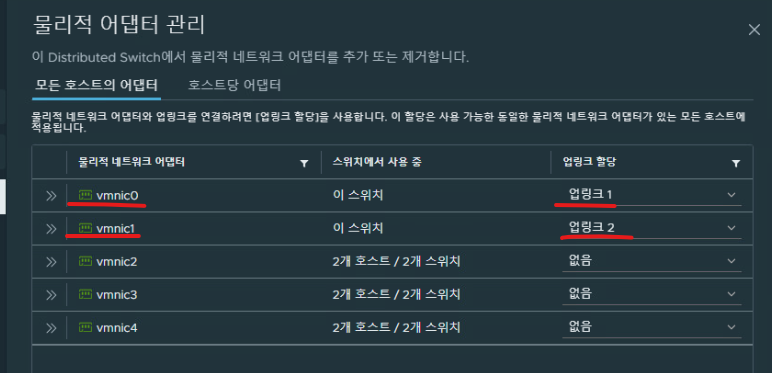 (5) 분산 스위치에서 사용할 두 가지 NIC 포트를 지정한다.