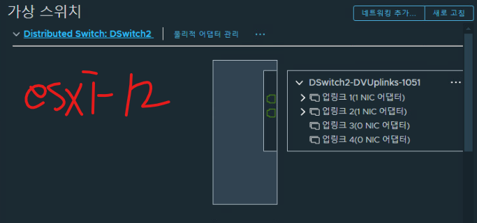 (2) ESXi-12 호스트 기준 가상 스위치 재구성이 완료되었다. (기존 실습 토폴로지 참고)