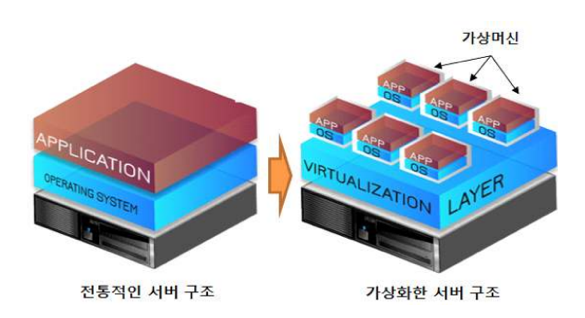 - 물리적 서버와 하드웨어를 통해 논리적인 컴퓨팅 환경을 구성하는데 이를 소프트웨어를 통해 구축하고 관리한다. 단일 서버의 자원을 동적으로 활용하고 운영할 수 있다.