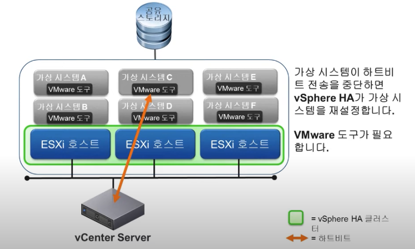 - vSphere의 주요 기능인 HA, DRS를 통해 비즈니스 연속성을 확보할 수 있다. 특정 호스트 장애 발생 시 VM을 다른 호스트로 이전시켜 서비스 다운 타임을 최소화하는 등의 방식으로 연속성을 확보한다.
