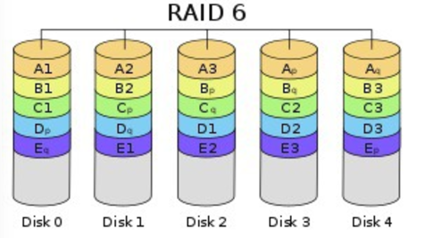 (3) 최소 4개의 디스크로 구성 가능하고 2개의 디스크 에러 시 복구 가능하다.( 3개 이상 디스크 에러 시 복구 불가) 안정성이 중요시되는 서버 환경에서 주로 사용된다.
