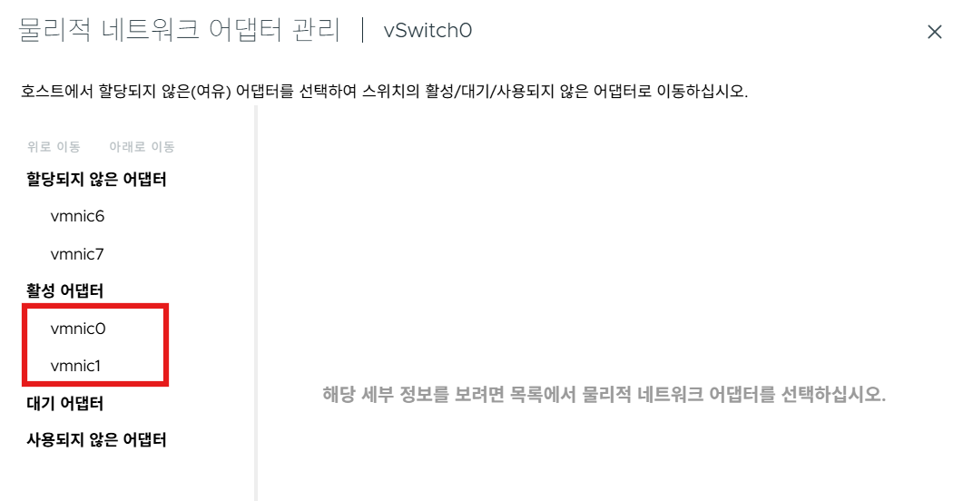 (1) VMNIC1을 VDS에 할당하기 위해 할당되지 않은 어댑터로 빼둔다.