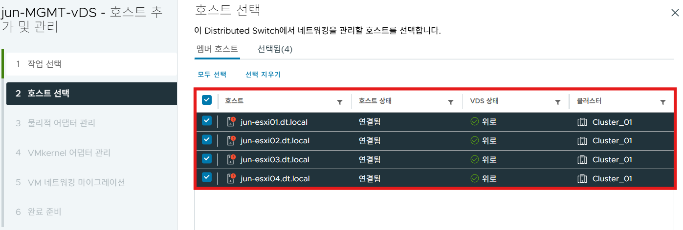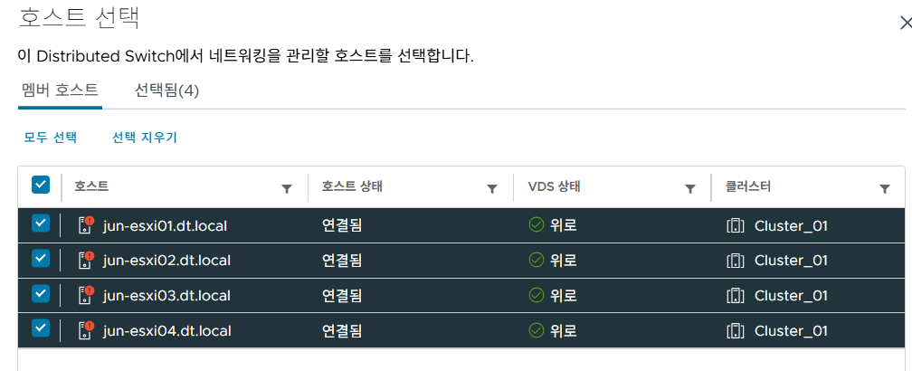 (1) 새로 생성한 vDS에 테스트할 호스트를 모두 추가한다.