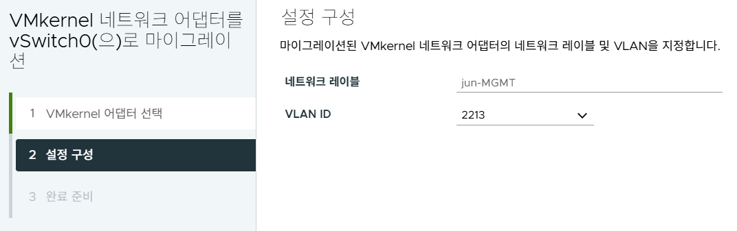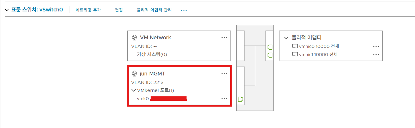 (4) 기존 표준 스위치에 각 호스트별로 존재하던 jun-MGMT 포트 그룹의 vmk0번을 지정한다. 그러면 위와 같이 기존 정보가 모두 표시된다.