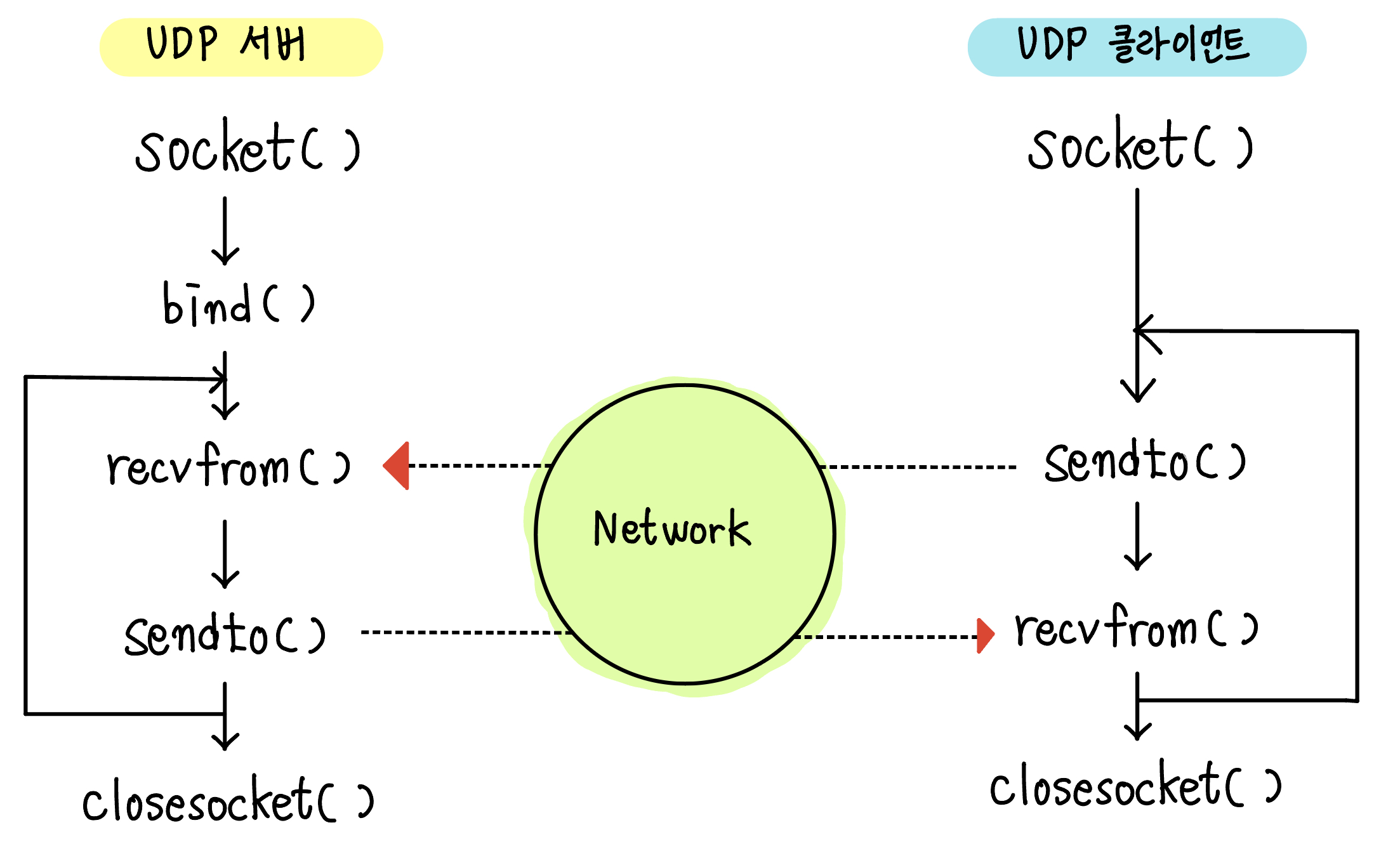 - 일반적으로 UDP 서버와 클라이언트는 아래와 그림과 같이 각각 나열된 순서로 소켓 함수를 호출합니다.